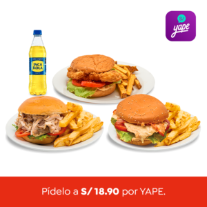 S/18.90Jugoso pollo a la brasa en trozos acompañado de papas fritas, ensalada de la casa, pan hamburguesa y cremas.